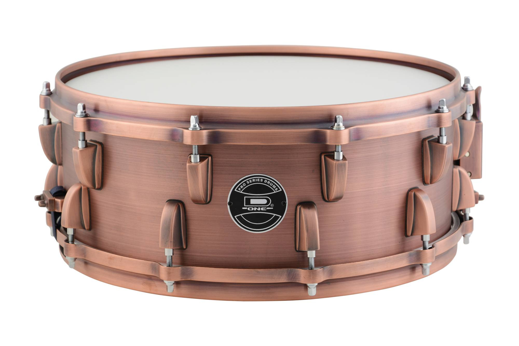 Esta é a linha de caixa D-One Cobre Envelhecido, timbre de médio para grave, sonoridade encorpada, aberta e harmônicos abundantes e definidos. Mantendo o padrão D-One nas canoas e aros Die-Cast.