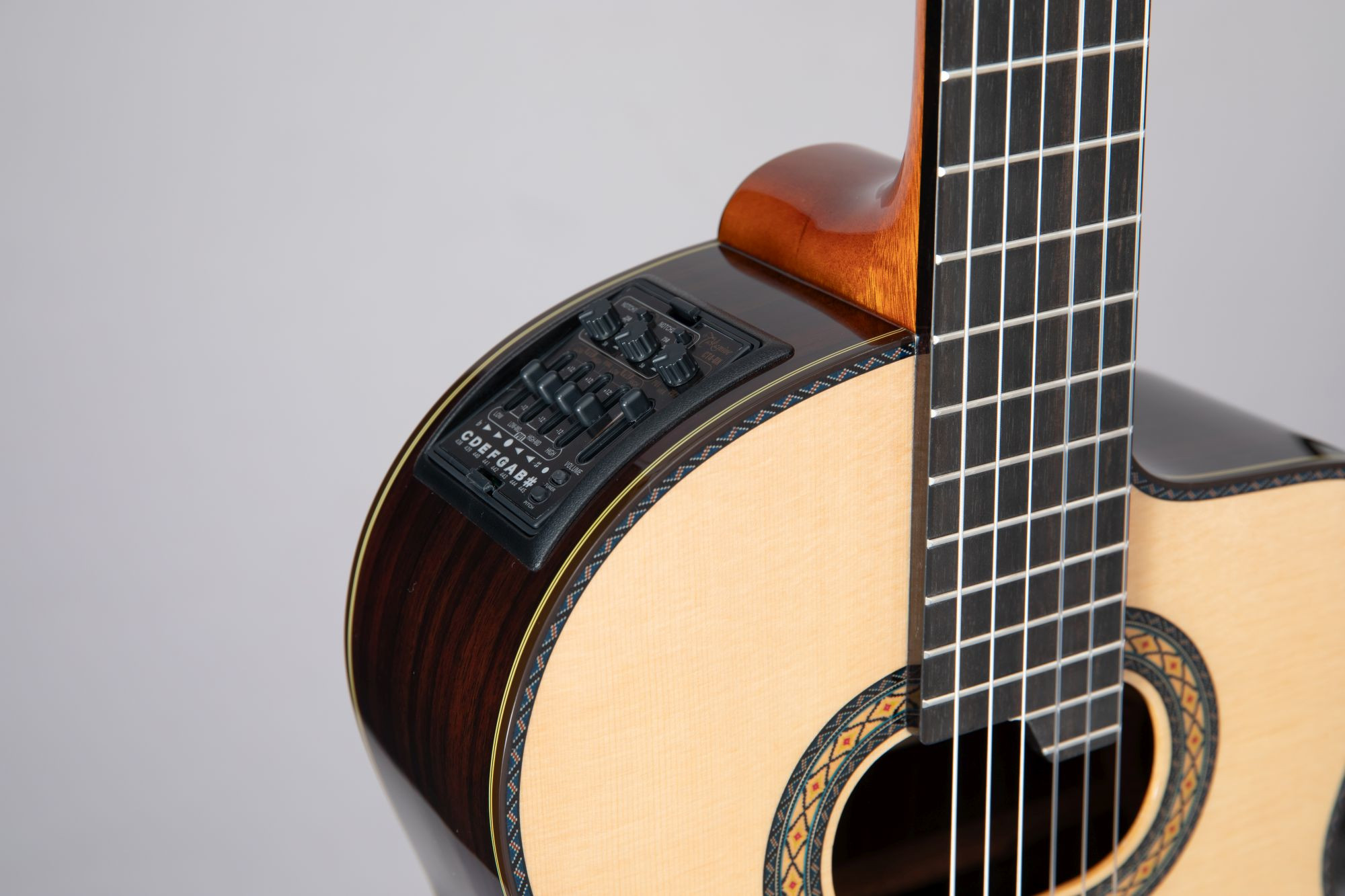 - Volume master Grave e Agudo (Captador 1 - Piezo) / Grave e Agudo (Captador 2 - Transducer) Mix (para misturar os sinais dos captadores), Notch Filter 1 (para o captador Piezo), Notch Filter 2 (para o captador Transducer), atenuadores integrados aos Notch Filters (-6 dB / -12 dB), afinador, ajuste de Pitch do afinador (Calibrador) e Check Baterias.